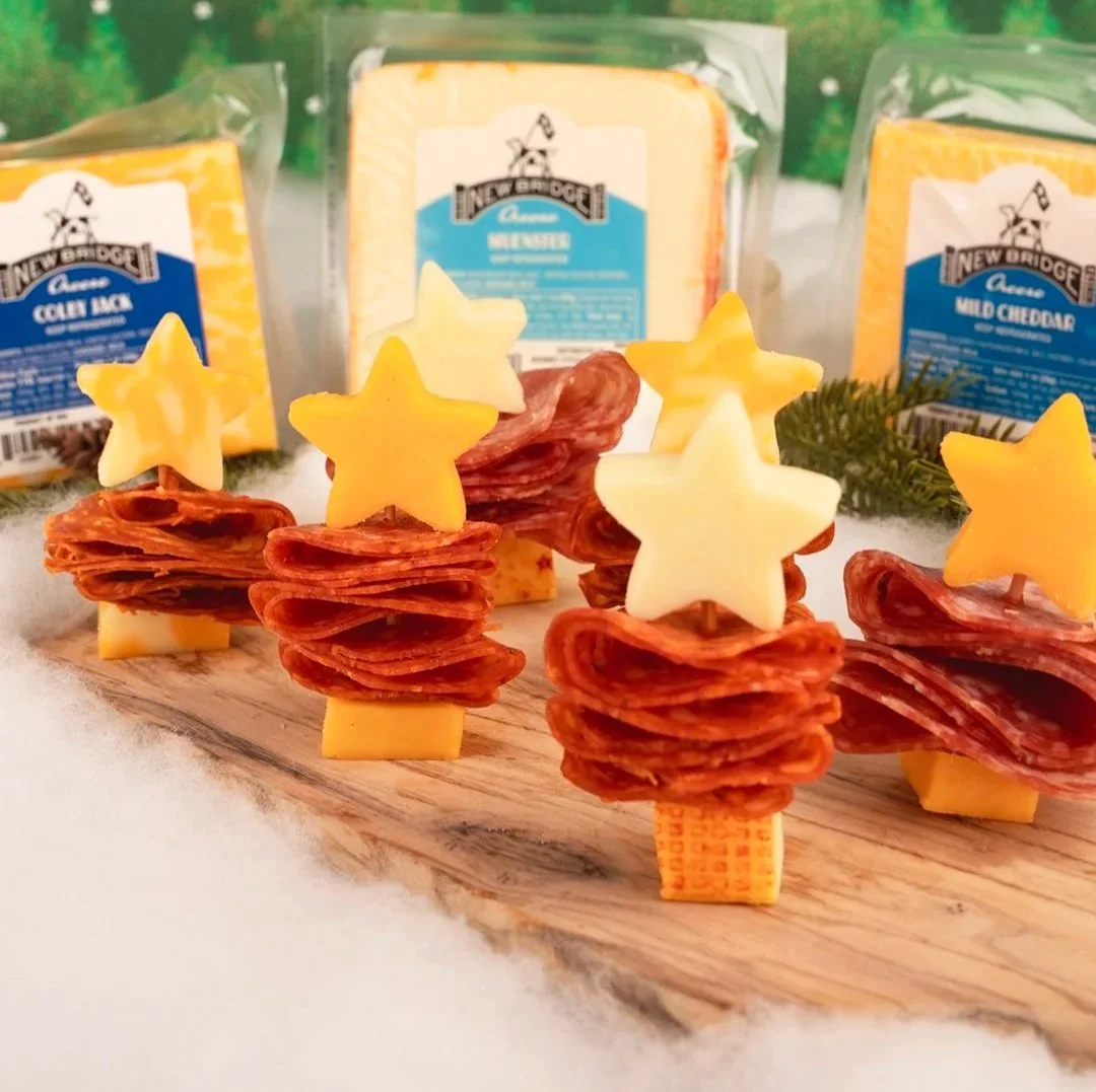 Slice New Bridge Muenster, Colby Jack, or Mild Cheddar, then use a small star cutter to punch out festive cheese stars. Set aside.